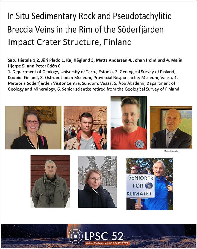 Geologiteamet var på många sökrundor i området och det resulterade under senhösten i flera betydelsefulla fynd. I teamet ingick Matts Andersén, Peter Edén, Malin Hjerpe och Johan Holmlund från Meteoria-sektionen samt Satu Hietala, GTK, meteoritkraterforskare och doktorand vid Tartu universitet och Kaj Höglund från Österbottens museum.