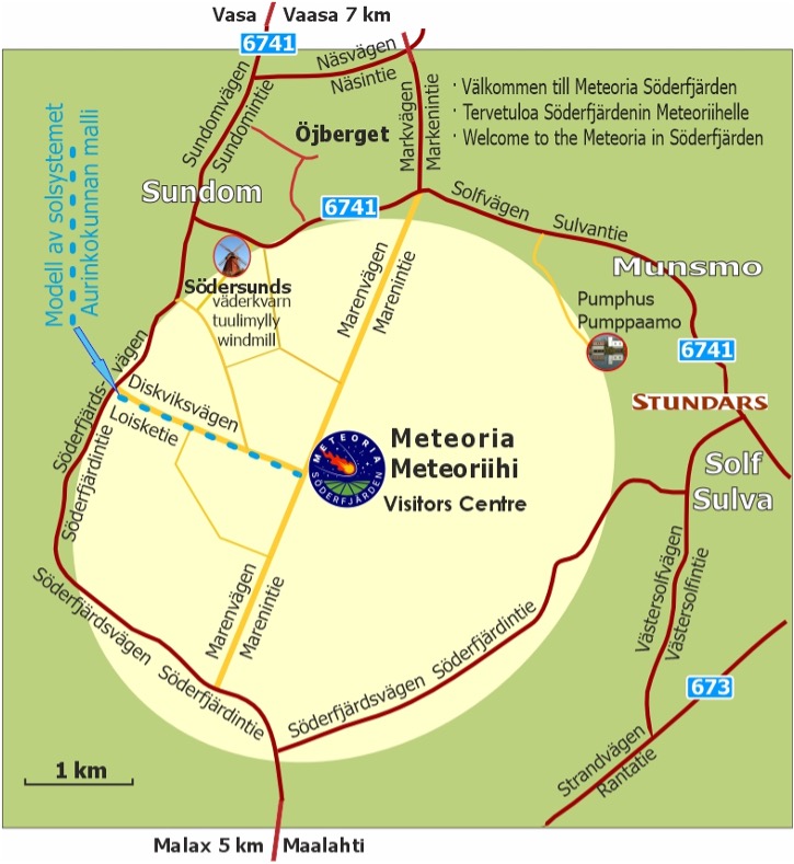 - Med bussturer Vasa-Sundom kan du nå hållplatser i byn som ger en vandring på 2-3 km över Söderfjärdens kraterslätt ut till Meteorian.